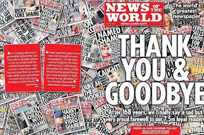 The News of the World published today its last issue, the 8674th,, bidding a “sad and proud farewell to its 7.5 million readers”, defiant and bombastic till the end. But is it the end of Rupert Murdoch too? Suddenly the powerful tycoon looked a tired old man as he ran for cover in Sun Valley, Idaho with hacks in hot pursuit. Today, competitors spent acres of newsprint poring over 40 years of Murdoch’s domination of the British media and political landscape, making or breaking the reputation of the great and the good. This was a perversion of our politics, orchestrated by a man whose power the establishment failed to check wrote The Observer. Politicians of all hues danced to his tune, but in a few hours the game has changed and the spell broken.